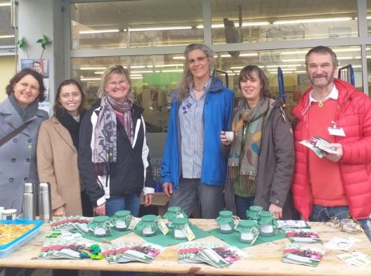 Reißenden Absatz fanden die – abseits des Üblichen – angebotenen Werbegeschenke: selbst hergestellter Badreiniger (der fast 100% plastikfrei genannt werden darf, da die Herstellungsprodukte in Glas und Karton erhältlich sind) sowie hochwertige Meisenknödel (ohne Netz, in das sich die Vögel verheddern könnten). „ Selbst bei kleinen Dingen ist uns der ökologische, nachhaltige Aspekt wichtig“, erklärt die Gemeinderats- und Kreistagskandidatin (Listenplatz 3) Kathrin Tröster. „ Außerdem wollen wir zum Nachmachen animieren.“