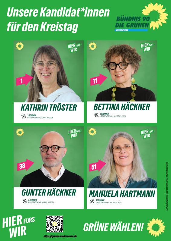 1. Kathrin Tröster (Gemeinderätin / K=Kreisrätin, Niederwerrn), 2. Johannes Weiß (K, Werneck), 3. Anna Krause (Sennfeld), 4. Stefan Weidinger (Grafenrheinfeld), 5. Stefanie Döpfner (K, Gerolzhofen), 6. Paul Knoblach (K, Bergrheinfeld), 7. Birgit Schmitt (K), 8. Udo Rumpel (K, beide Werneck), 9. Patricia Kaspar (Sulzheim), 10. Christian Schäflein (Schonungen).