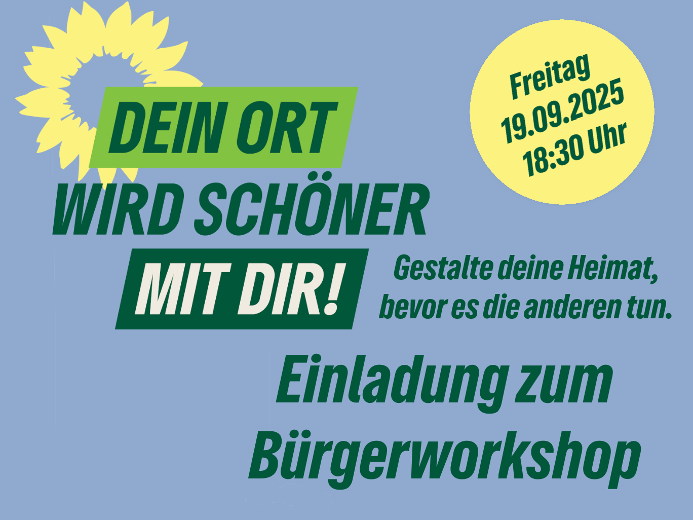 Die Vorbereitungen für die kommende Kommunalwahl laufen bereits an. In diesem Workshop wollen wir gemeinsam mit euch die Weichen für eine lebenswerte Zukunft stellen. Bringt gerne eure Ideen und Vorschläge ein – was ist euch wichtig für die Zukunft von Nieder- und Oberwerrn? Kommt vorbei und gestaltet mit!